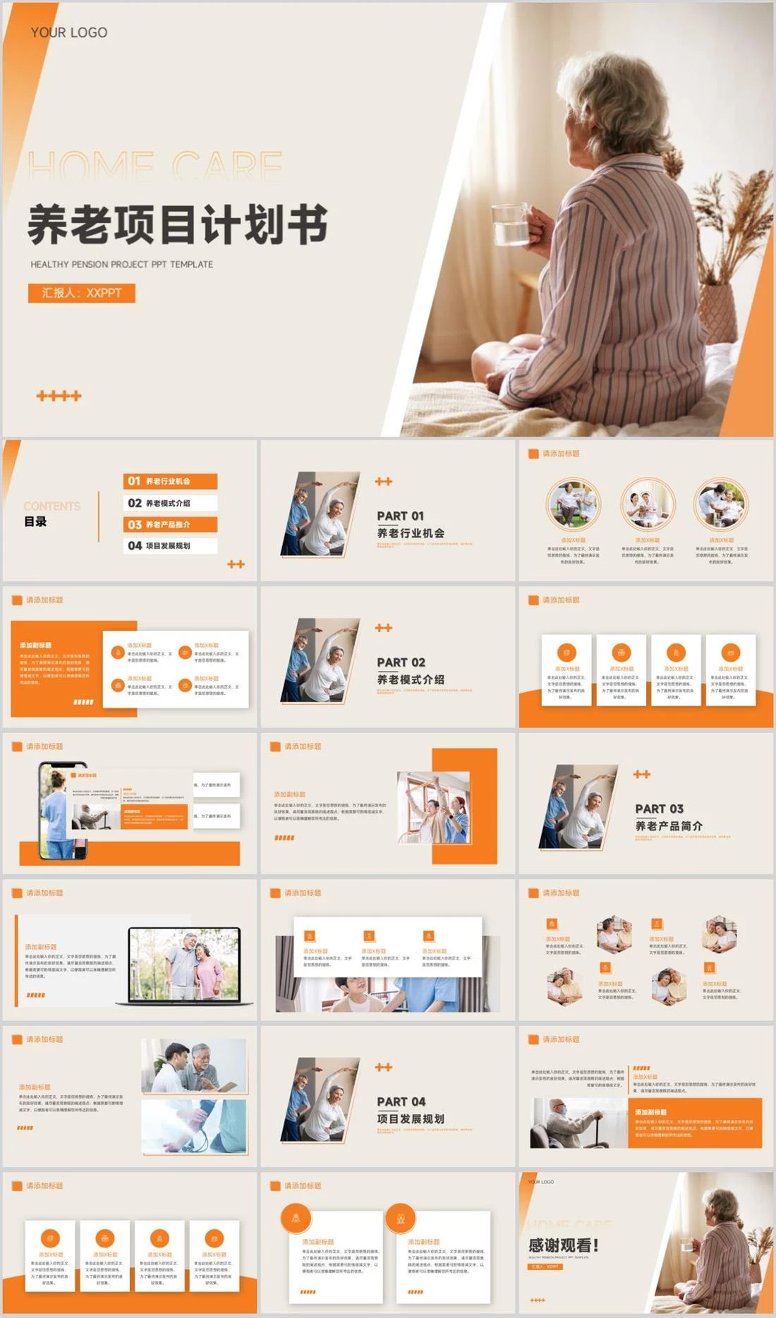 养老项目计划书HEALTHY PENSION PROJECT PPT TEMPLATE汇报人:XXPPTHOME CAREYOUR LOGO智慧养老,521,