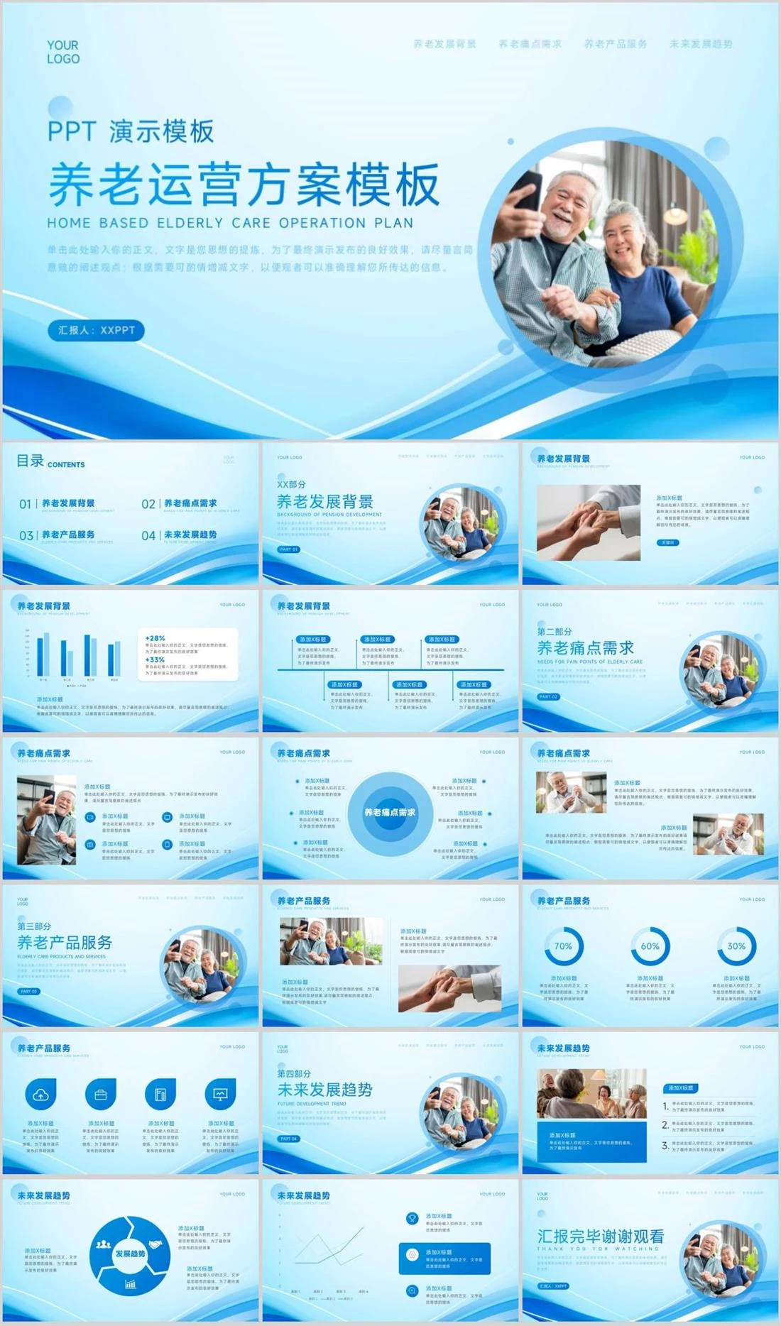 HOME BASED ELDERLY CARE OPERATION PLANYOUR LOGO汇报人:XXPPTPPT 演示模板养老运营方案模板单击此处输入你的正文,文字是您思想的提炼,为了最终演示发布的良好效果,请尽量言简意赅的阐述观点;根据需要可酌情增减文字,以便观者可以准确理解您所传达的信息。智慧养老,567,