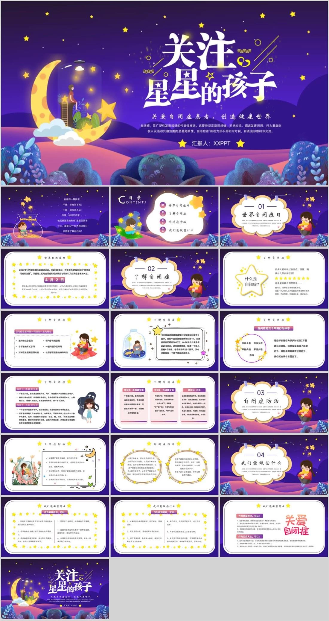 关爱自闭症患者,创造健康世界自闭症,是广泛性发育障碍的代表性疾病。这要特征是漠视感情、拒绝交流、语言发育迟滞、行为重复刻板以及活动兴趣范围的显著局限性。自闭症者“有视力却不愿和你对视,有语言却难和你交流。汇报人:XXPPT校园活动,467,