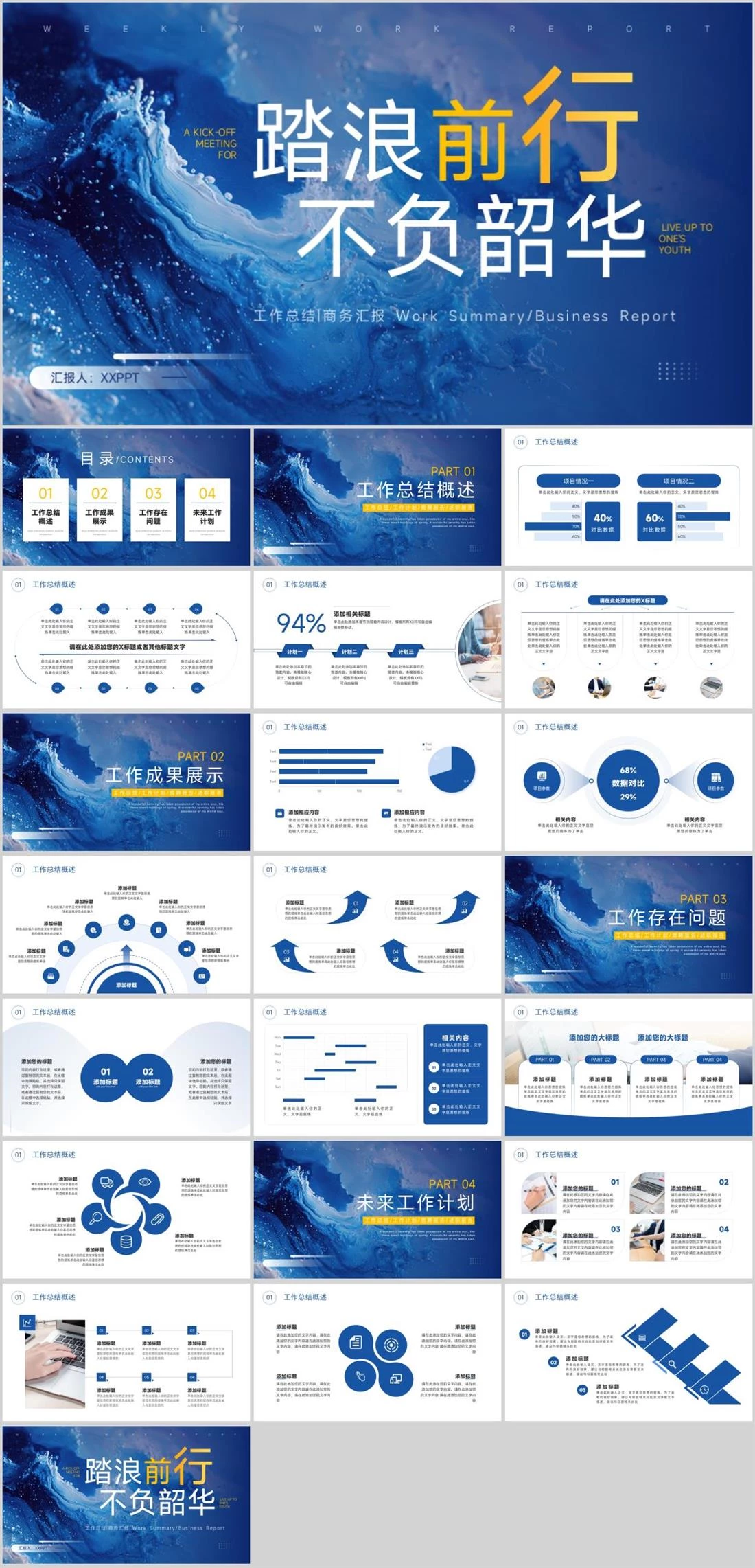 踏浪前A KICK-OFFMEETING FOR行工作总结|商务汇报Work Summary/Business ReportWEEKLY WORK REPORT不负韶华 LIVE UP TO ONE'S YOUTH汇报人:XXPPT ——年终总结,1899,