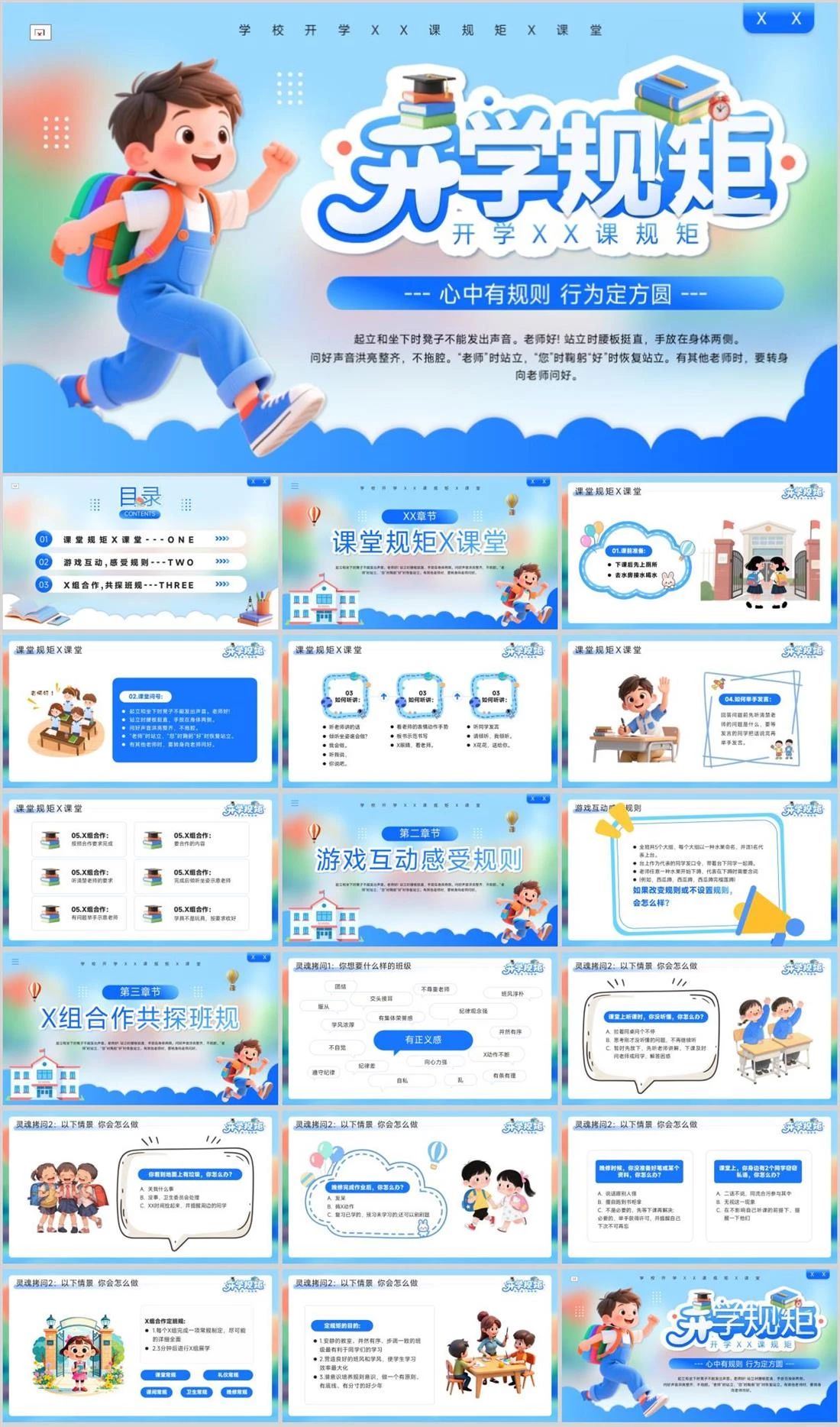 学规矩开学XX课规矩--- 心中有规则 行为定方圆 ---XX起立和坐下时凳子不能发出声音。老师好! 站立时腰板挺直,手放在身体两侧。问好声音洪亮整齐,不拖腔。“老师”时站立,“您”时鞠躬“好”时恢复站立。有其他老师时,要转身向老师问好。学校开学XX课规矩X课堂开学,167,