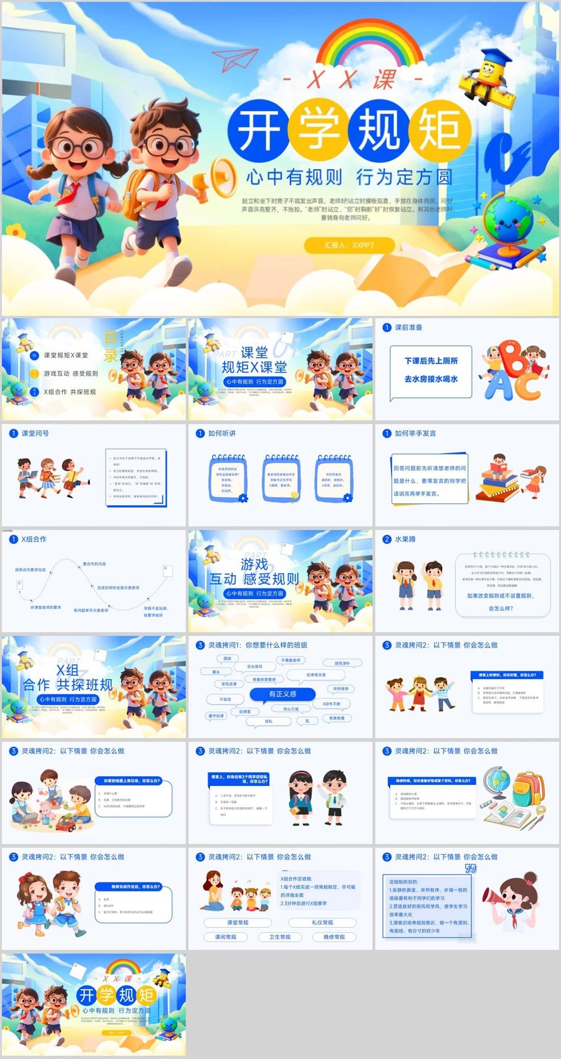 开学规矩起立和坐下时凳子不能发出声音。老师好!站立时腰板挺直,手放在身体两侧。问好声音洪亮整齐,不拖腔。“老师”时站立,“您”时鞠躬“好”时恢复站立。有其他老师时,要转身向老师问好。汇报人:XXPPT-XX课-心中有规则 行为定方圆开学,169,