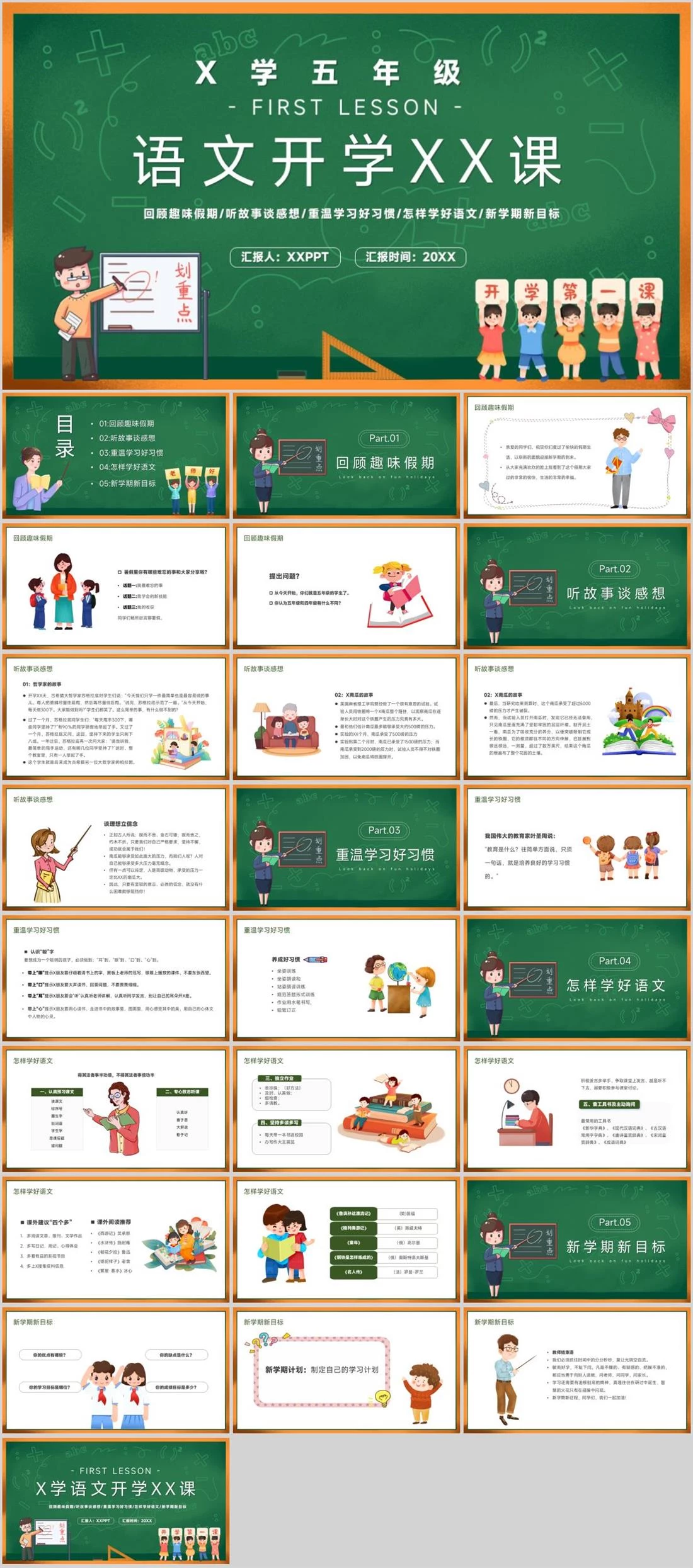 语文开学XX课回顾趣味假期/听故事谈感想/重温学习好习惯/怎样学好语文/新学期新目标汇报人:XXPPT汇报时间:20XX- FIRST LESSON -X学五年级开学主题,974,