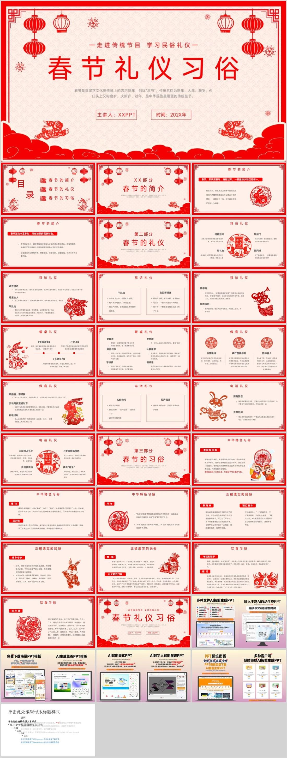 春节礼仪习俗—走进传统节目 学习民俗礼仪—主讲人:XXPPT时间:202X年春节是指汉字文化圈传统上的农历新年,俗称“年节”,传统名称为新年、大年、新岁,但口头上又称度岁、庆新岁、过年,是中华民族最隆重的传统佳节。红色主题,5,