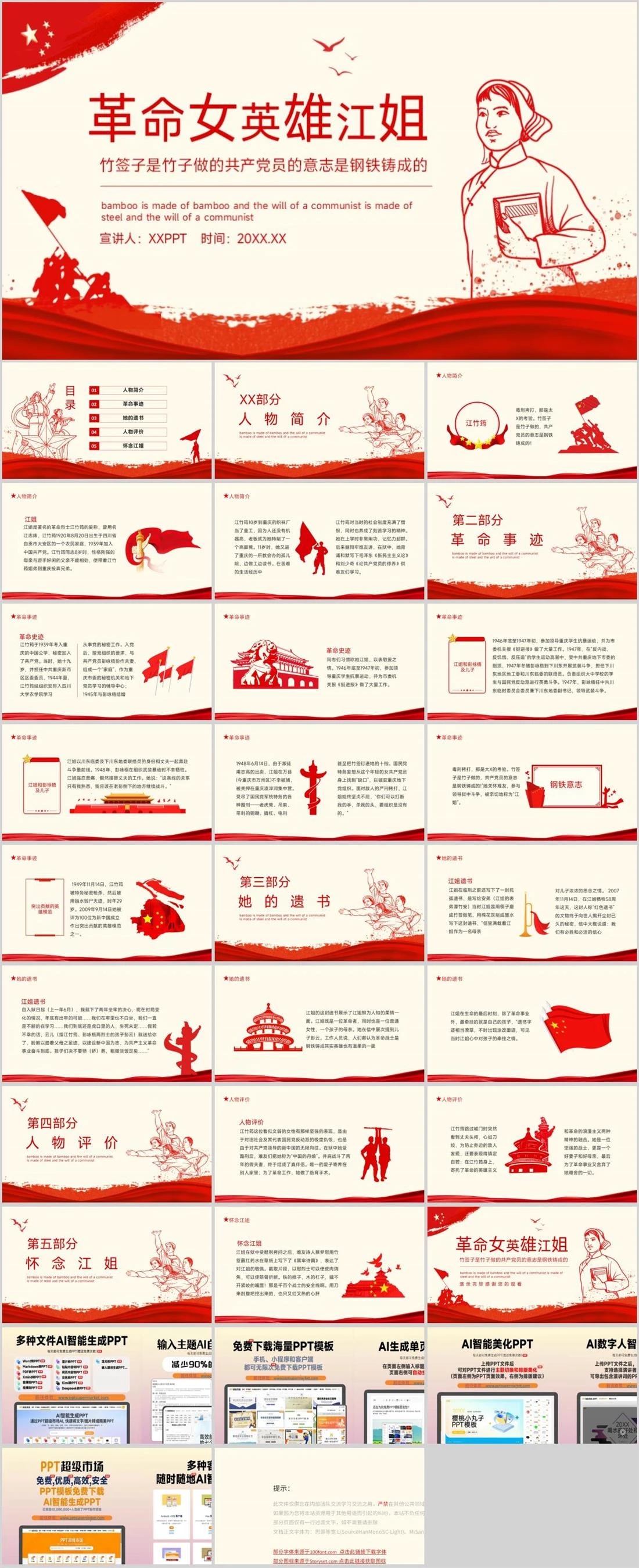 革命女英雄江姐竹签子是竹子做的共产党员的意志是钢铁铸成的bamboo is made of bamboo and the will of a communist is made of steel and the will of a communist宣讲人:XXPPT 时间:20XX.XX红色英雄故事,1517,