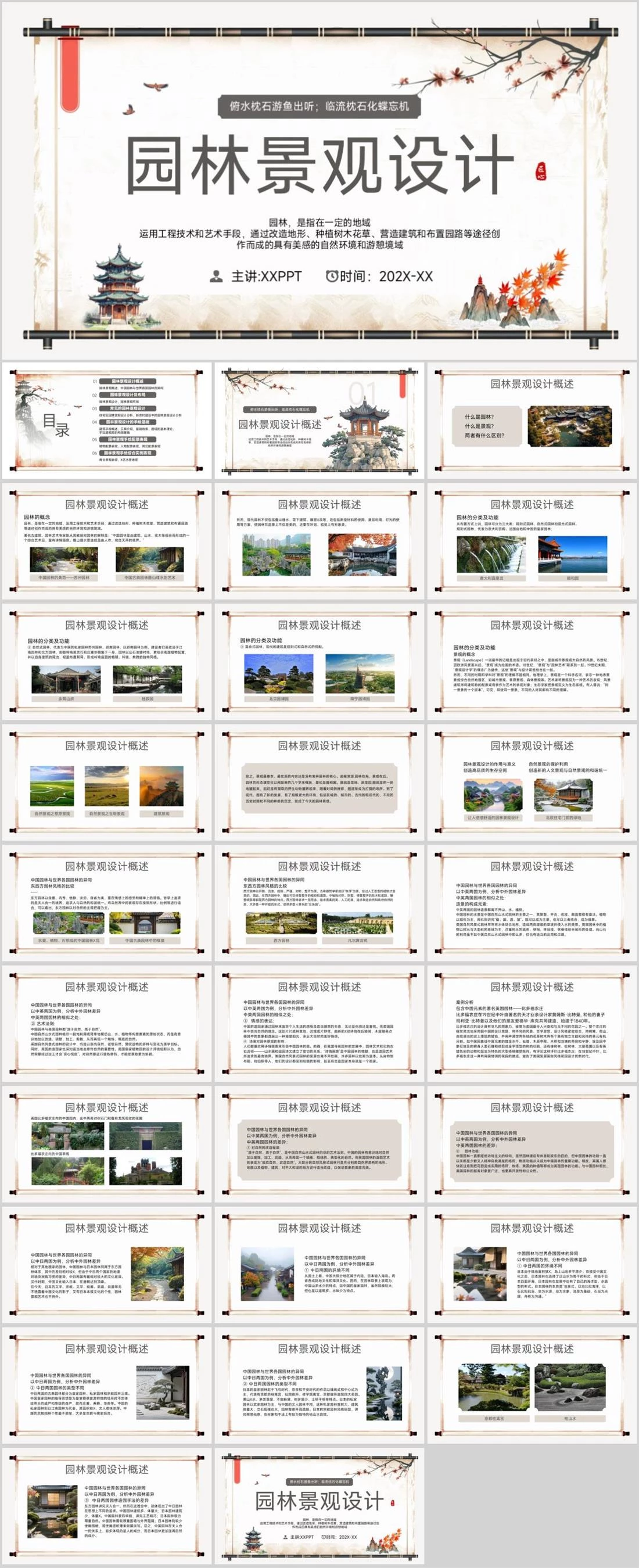 园林景观设计园林,是指在一定的地域运用工程技术和艺术手段,通过改造地形、种植树木花草、营造建筑和布置园路等途径创作而成的具有美感的自然环境和游憩境域俯水枕石游鱼出听;临流枕石化蝶忘机主讲:XXPPT时间:202X-XX园林景观,2379,