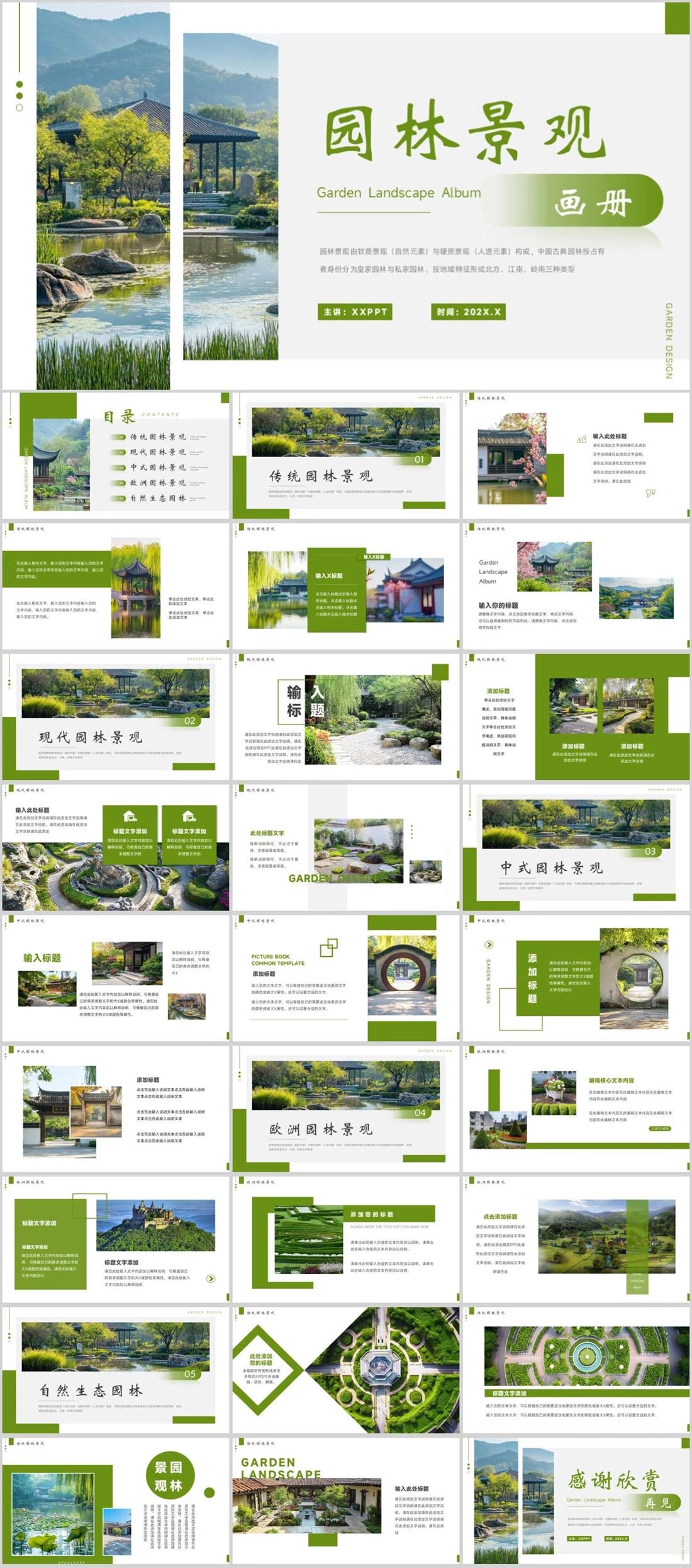 园林景观画册Garden Landscape Album园林景观由软质景观(自然元素)与硬质景观(人造元素)构成,中国古典园林按占有者身份分为皇家园林与私家园林,按地域特征形成北方、江南、岭南三种类型主讲:XXPPT时间:202X.XGARDEN DESIGN园林景观,2390,