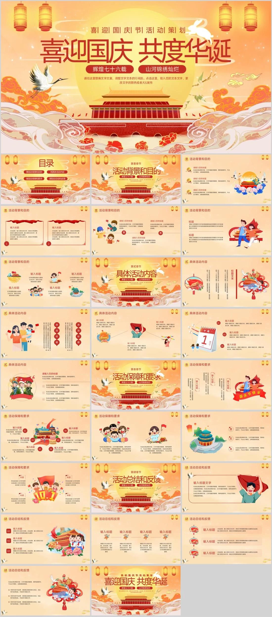 喜迎国庆共度华诞喜|迎|国|庆|节|活|动|策|划辉煌七十六载山河锦绣灿烂请在这里替换文字文案,调整文字文本的行间距。点击这里,输入您的文本文字,更改文字的颜色或者大X属性国庆节,
