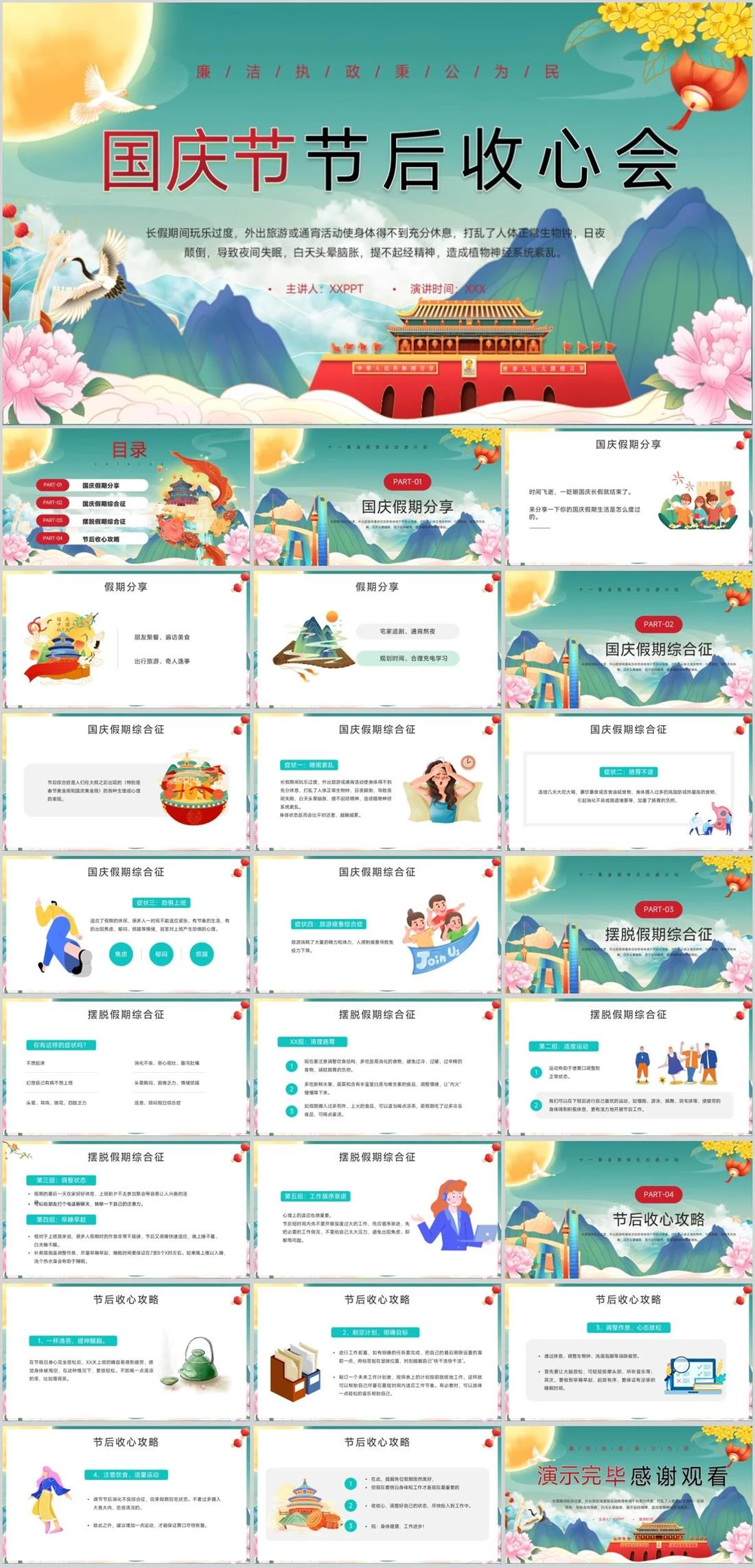 国国庆庆节节后后收收心心会会节节廉/洁/执/政/秉/公/为/民主讲人:XXPPT演讲时间:XXX长假期间玩乐过度,外出旅游或通宵活动使身体得不到充分休息,打乱了人体正常生物钟,日夜颠倒,导致夜间失眠,白天头晕脑胀,提不起经精神,造成植物神经系统紊乱。国庆节,2708,