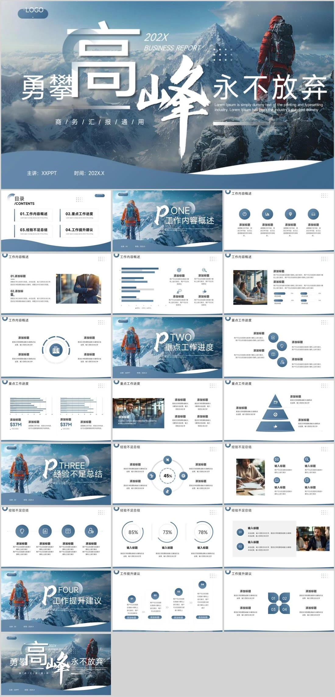 勇攀高商/务/汇/报/通/用202XBUSINESS REPORT·LOGO·主讲:XXPPT 时间:202X.X永不放弃Lorem Ipsum is simply dummy text of the printing and typesetting industry. Lore工作总结,2224,
