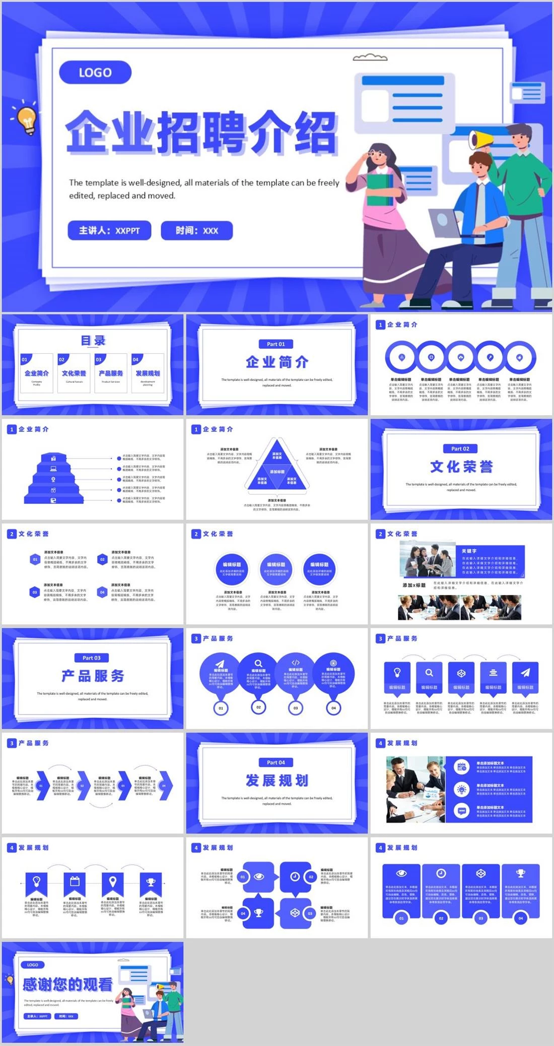 LOGO企业招聘介绍The template is well-designed, all materials of the template can be freely edited, replaced and moved.主讲人:XXPPT时间:XXX企业招聘介绍,