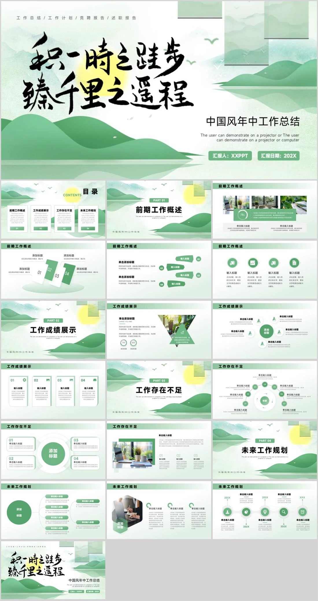 中国风年中工作总结The user can demonstrate on a projector or The user can demonstrate on a projector or computer汇报人:XXPPT 汇报日期:202X工作总结/工作计划/竞聘报告/述职报告励志商务风,266,