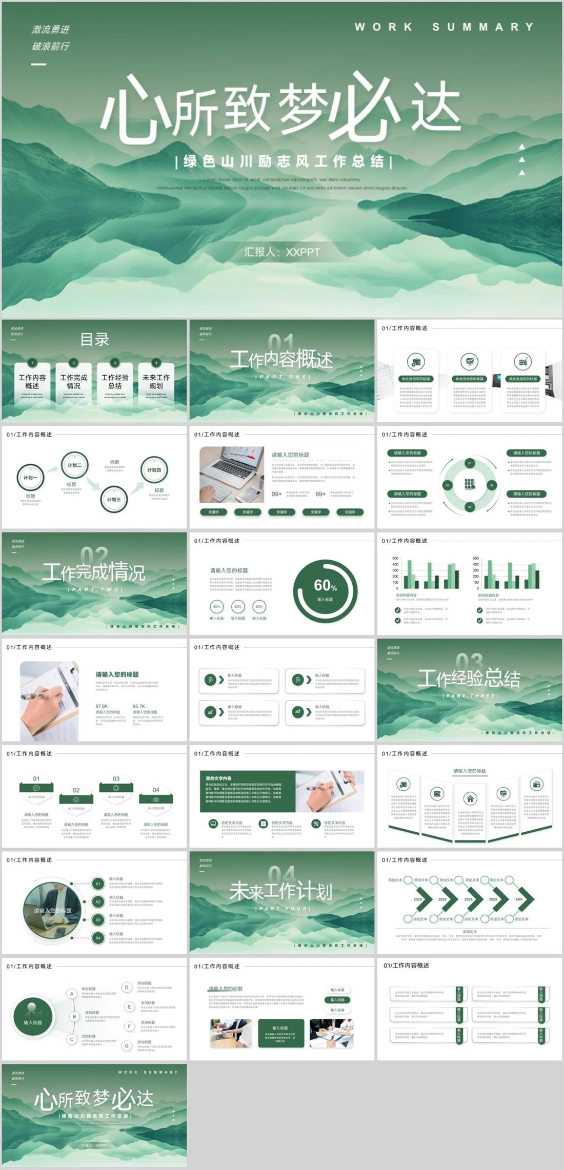 WORK SUMMARY激流勇进破浪前行 |绿色山川励志风工作总结|心所致必梦达汇报人:XXPPT Lorem ipsum dolor sit amet, consectetuer dipiscing elit, sed diam nonummynibheuismod tincidunt ut l励志商务风,268,