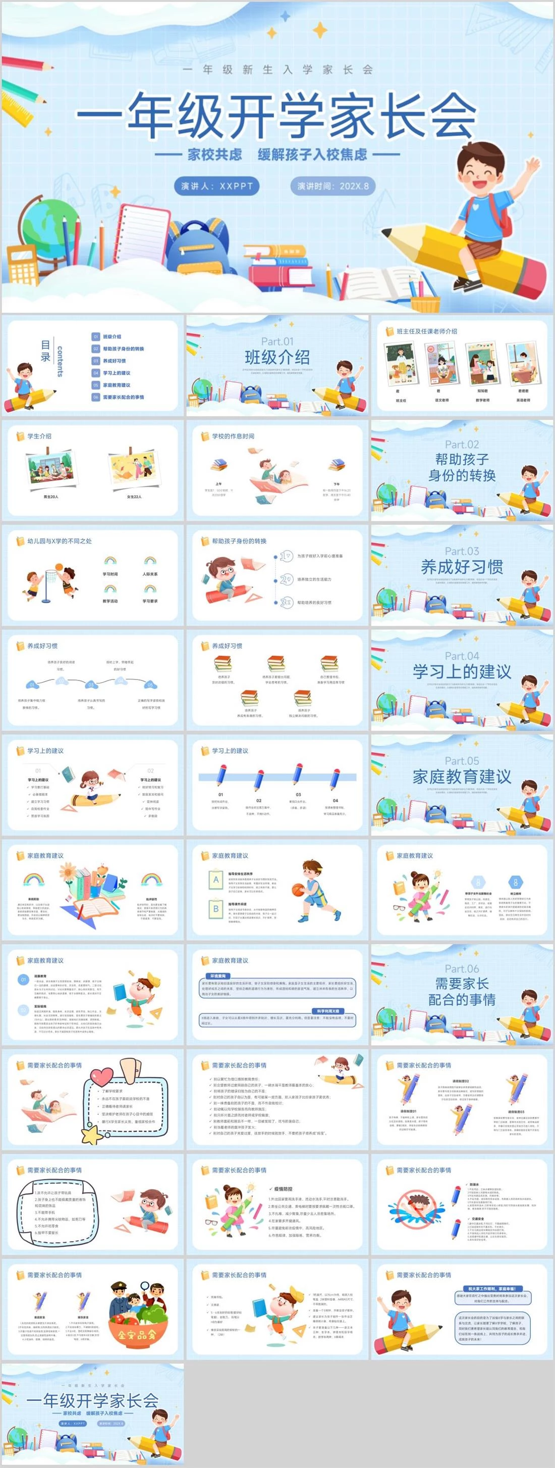 一年级开学家长会一年级开学家长会一年级新生入学家长会演讲人:XXPPT演讲时间:202X.8—— 家校共虑 缓解孩子入校焦虑 ——开学第一课,2035,