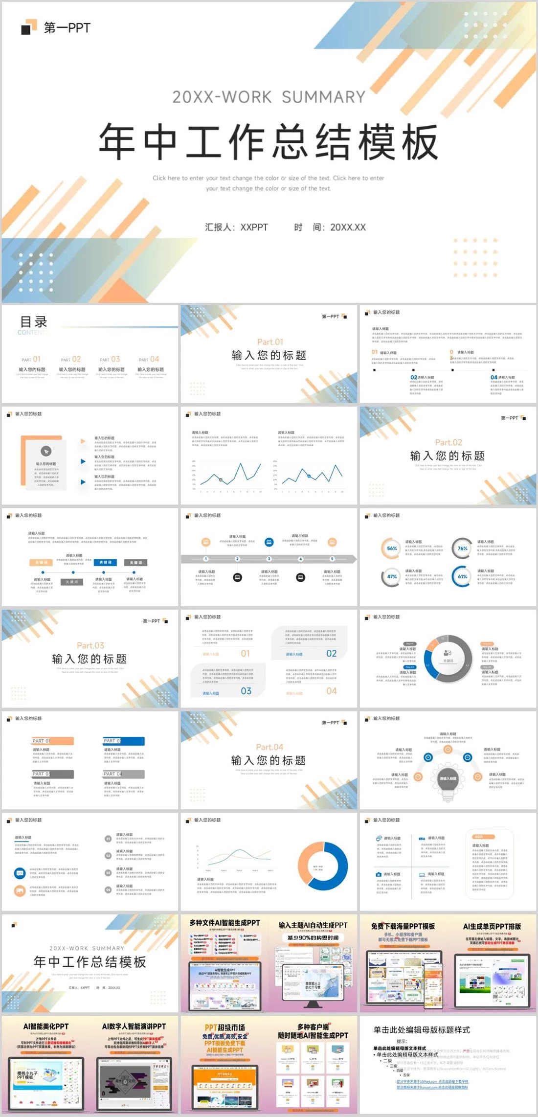 第一PPT年中工作总结模板汇报人:XXPPT时 间:20XX.XXClick here to enter your text change the color or size of the text. Click here to enter your text change the color or s欧美高端,