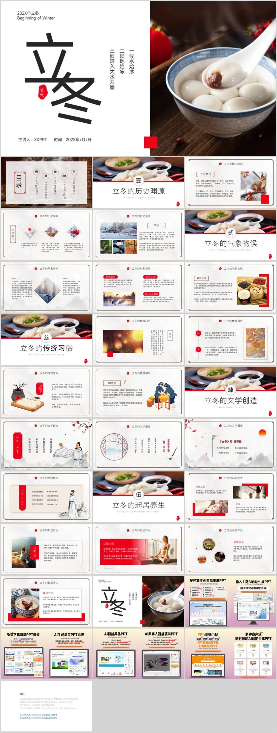 202X年立冬Beginning of Winter时间:202X年ⅹ月ⅹ日主讲人:XXPPT冬立一候水始冰二候地始冻三候雉入大水为蜃节气立冬,