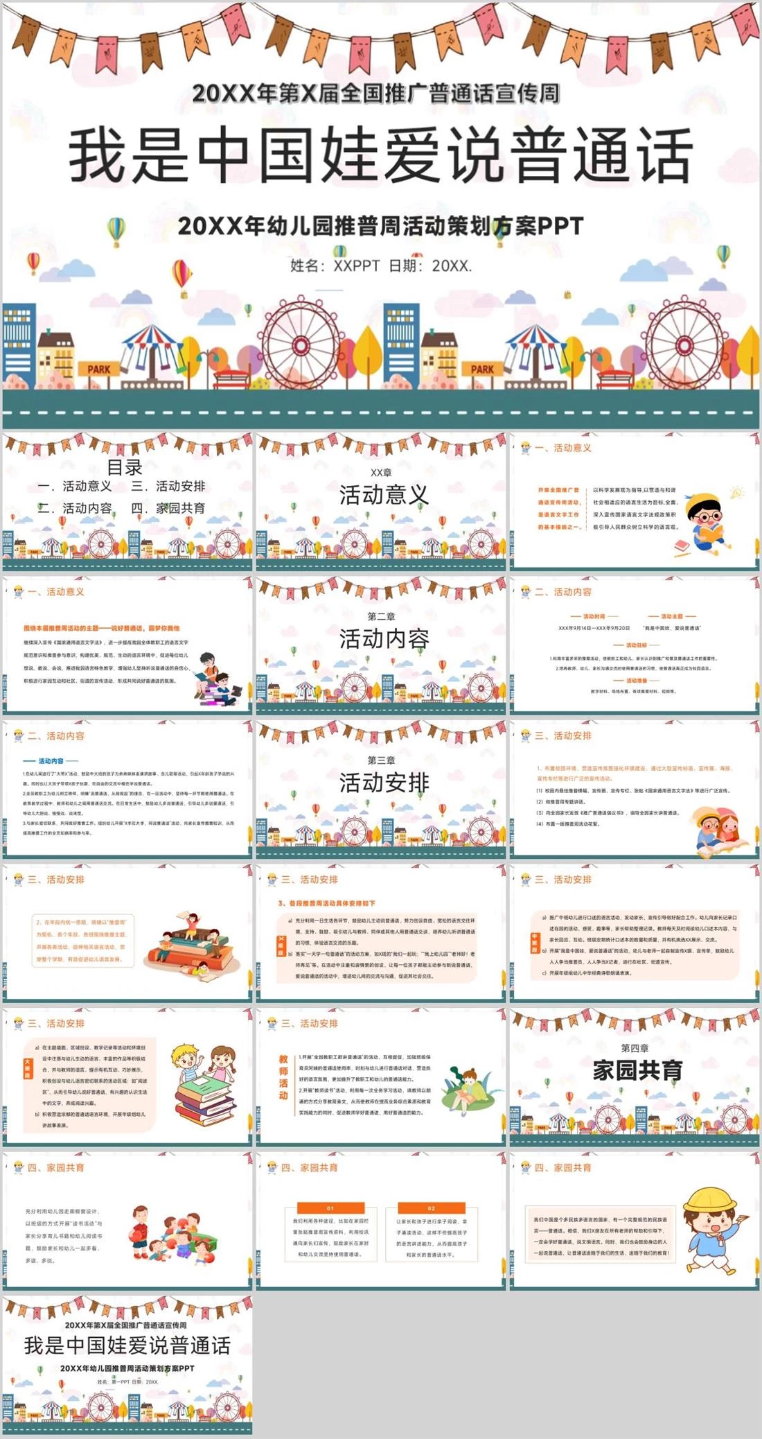 20XX年幼儿园推普周活动策划方案PPT我是中国娃爱说普通话20XX年第X届全国推广普通话宣传周姓名:XXPPT 日期:20XX.幼儿教育,1696,