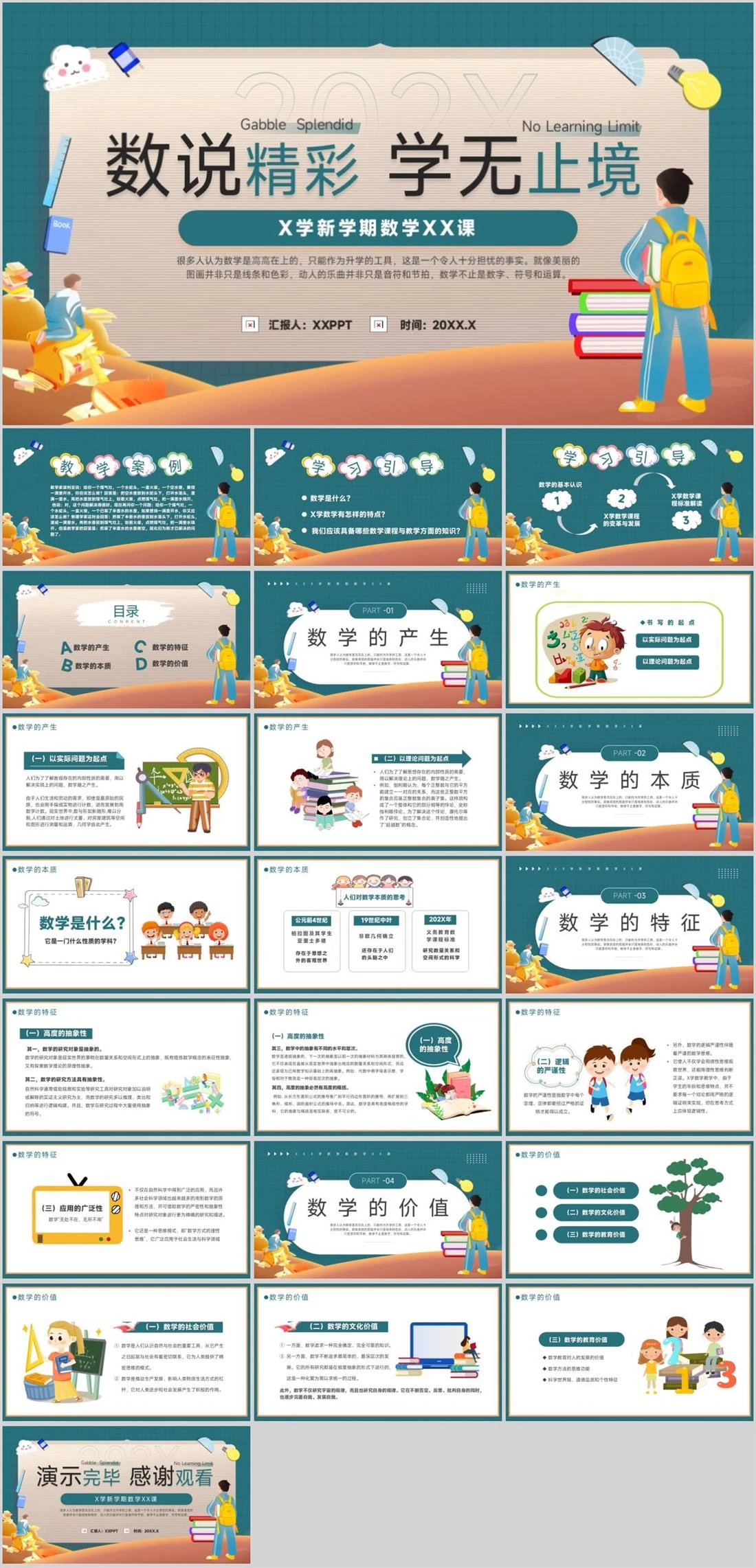 X学新学期数学XX课很多人认为数学是高高在上的,只能作为升学的工具,这是一个令人十分担忧的事实。就像美丽的图画并非只是线条和色彩,动人的乐曲并非只是音符和节拍,数学不止是数字、符号和运算。汇报人:XXPPT 时间:20XX.X202X数说精彩学无止境No Learning LimitGabble Sp开学,160,
