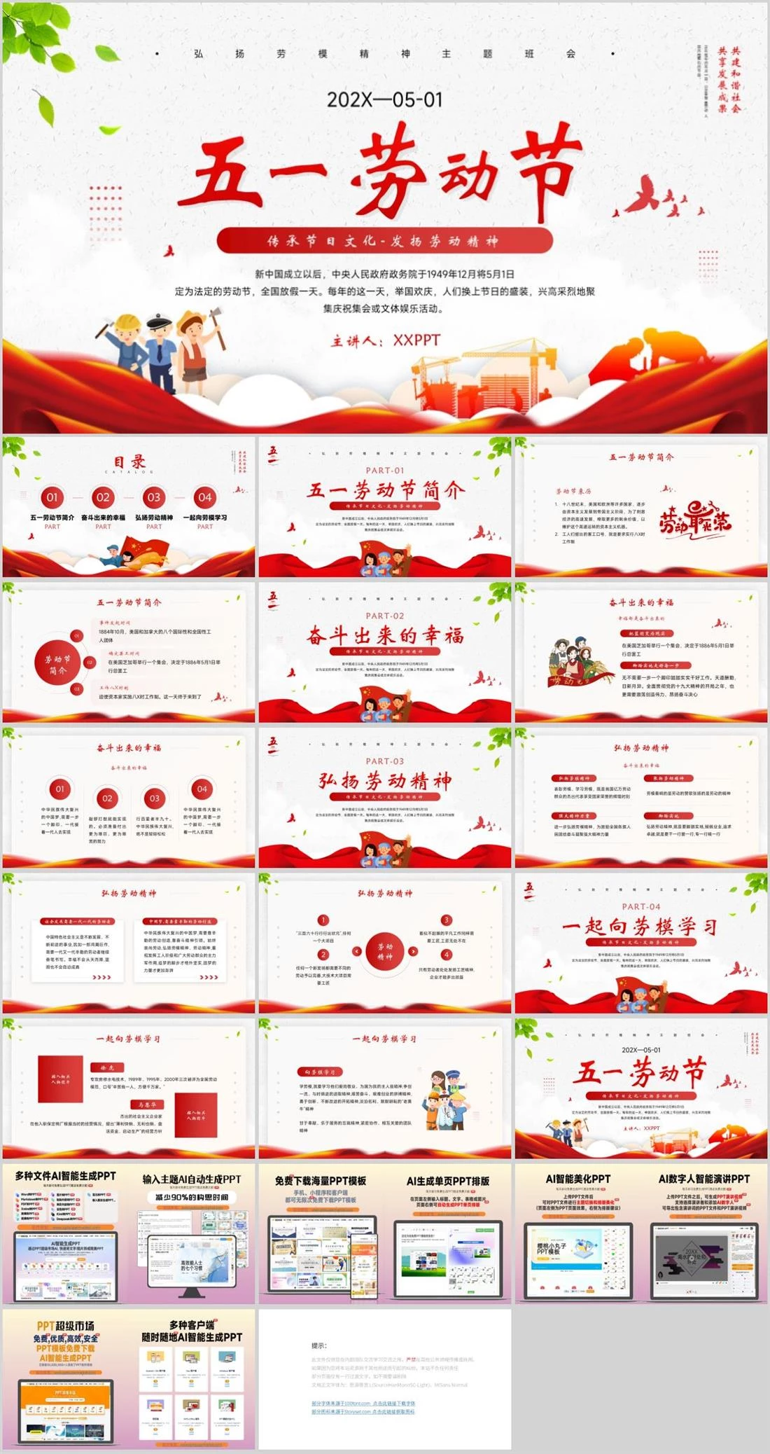•弘扬劳模精神主题班会•新中国成立以后,中央人民政府政务院于1949年12月将5月1日定为法定的劳动节,全国放假一天。每年的这一天,举国欢庆,人们换上节日的盛装,兴高采烈地聚集庆祝集会或文体娱乐活动。定在每年的五月一日。它是全世界劳动 人民共同拥有的节日。共建和谐社会共享发展成果五一劳动节传承节日文节日班会,104,