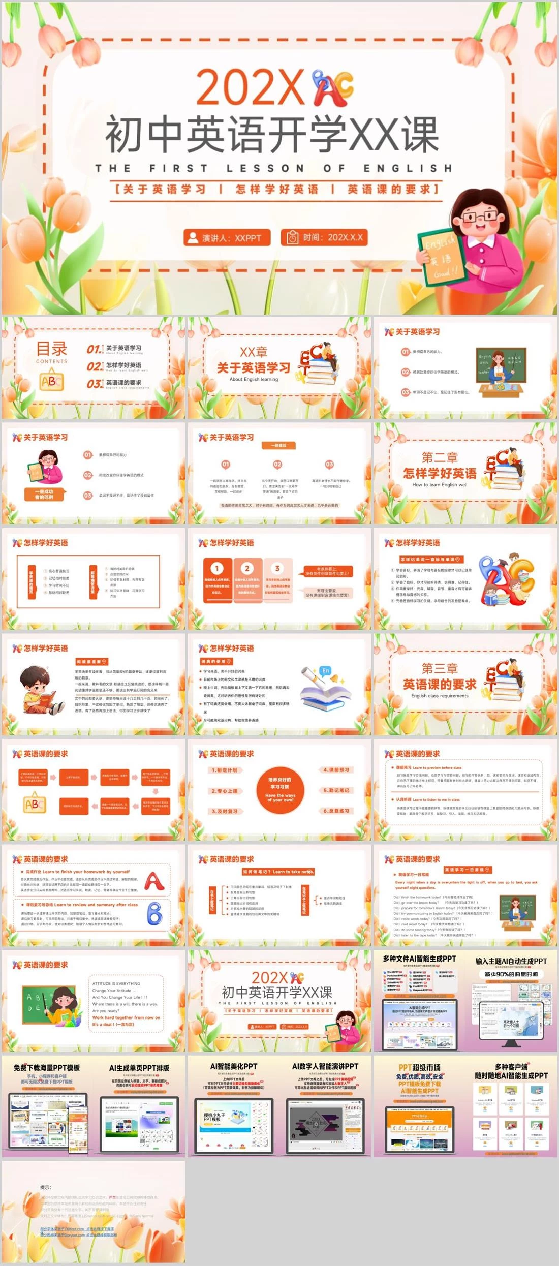 THE FIRST LESSON OF ENGLISH初中英语开学XX课202X[关于英语学习 | 怎样学好英语 | 英语课的要求]演讲人:XXPPT时间:202X.X.X英语开学,1435,