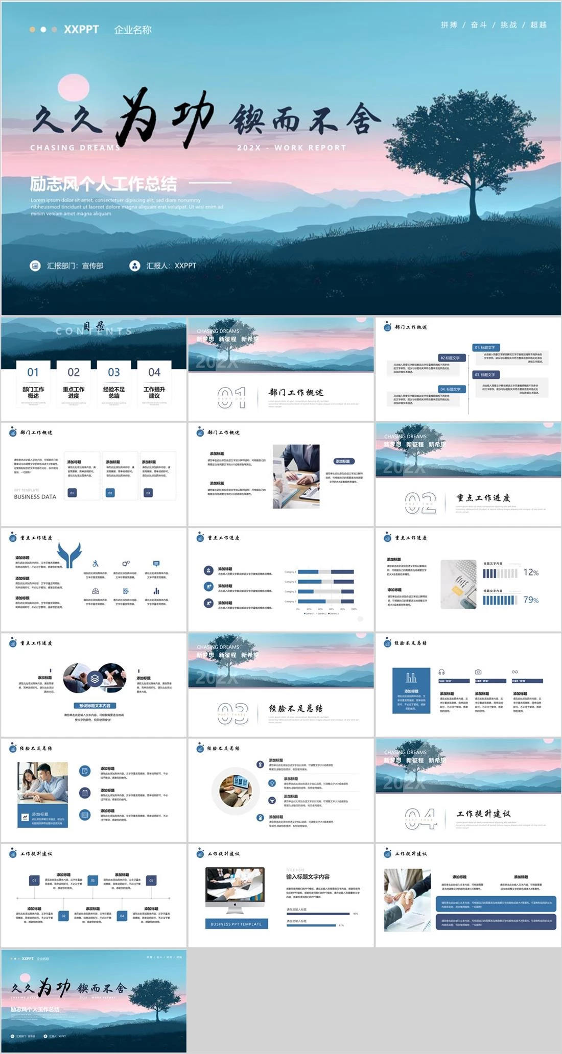 拼搏 / 奋斗 / 挑战 / 超越汇报部门:宣传部汇报人:XXPPT 202X - WORK REPORT励志风个人工作总结XXPPT企业名称Lorem ipsum dolor sit amet, consectetuer dipiscing elit, sed diam n164131528,工作总结,14192,