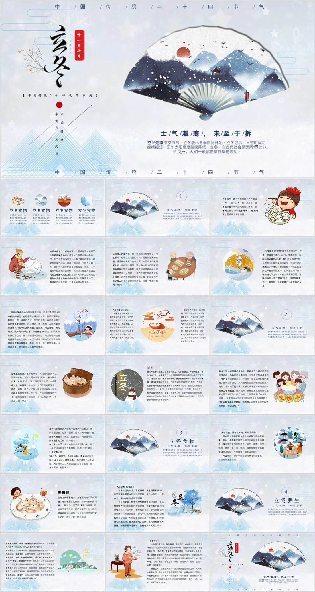 中/国/传/统/二/十/四/节/气中/国/传/统/二/十/四/节/气立冬是季节类节气,立冬表示冬季自此开始。立冬过后,日照时间将继续缩短,正午太阳高度继续降低。立冬,在古代社会是民间“四时八节”之一,人们一般都要举行祭祀活动。士/气/凝/寒/,未/至/于/拆164131528,立冬,10515,