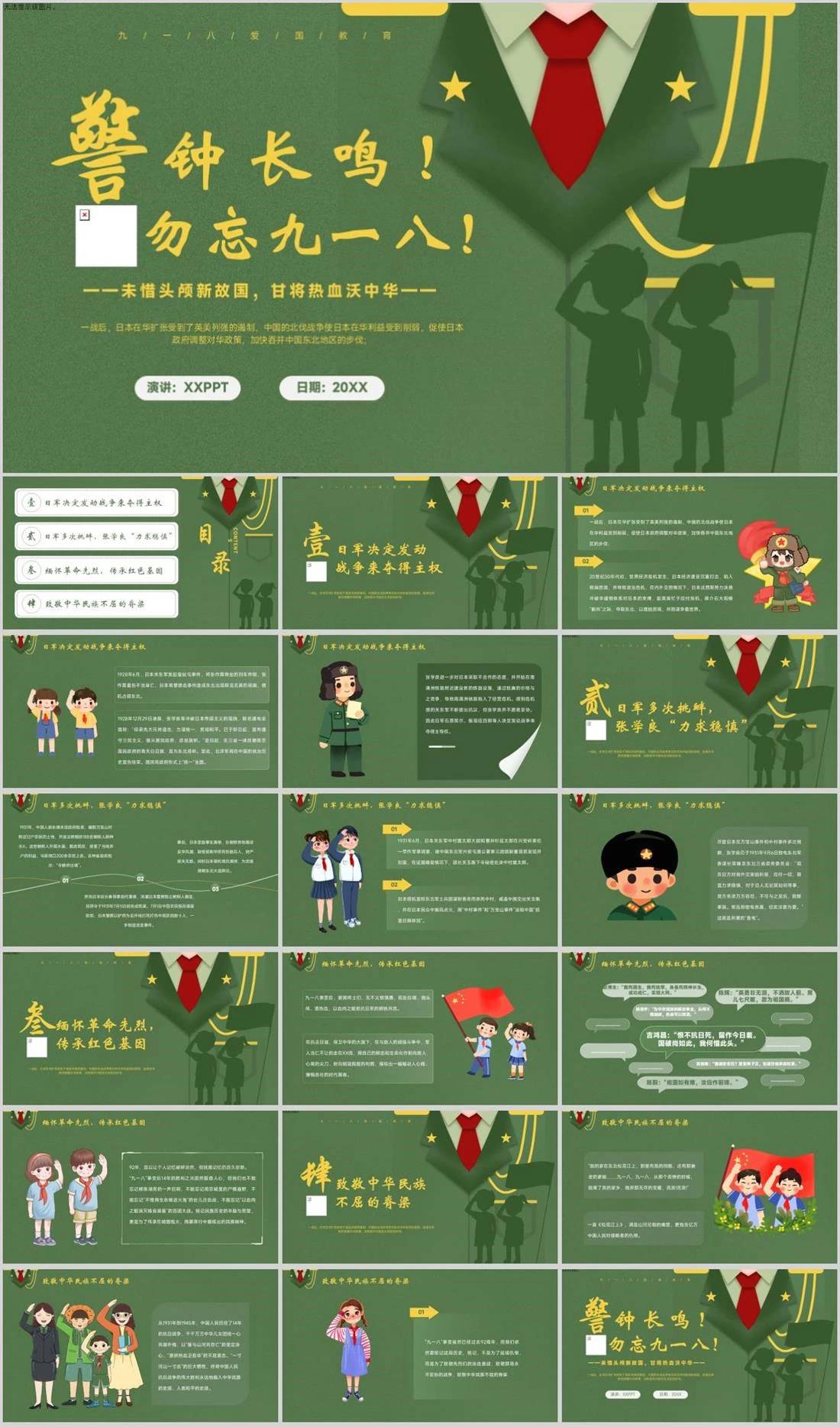 ——未惜头颅新故国,甘将热血沃中华——一战后,日本在华扩张受到了英美列强的遏制,中国的北伐战争使日本在华利益受到削弱,促使日本政府调整对华政策,加快吞并中国东北地区的步伐;演讲:XXPPT日期:20XX钟长鸣!勿忘九一八!警九/一/八/爱/国/教/育九一八事变,1626,