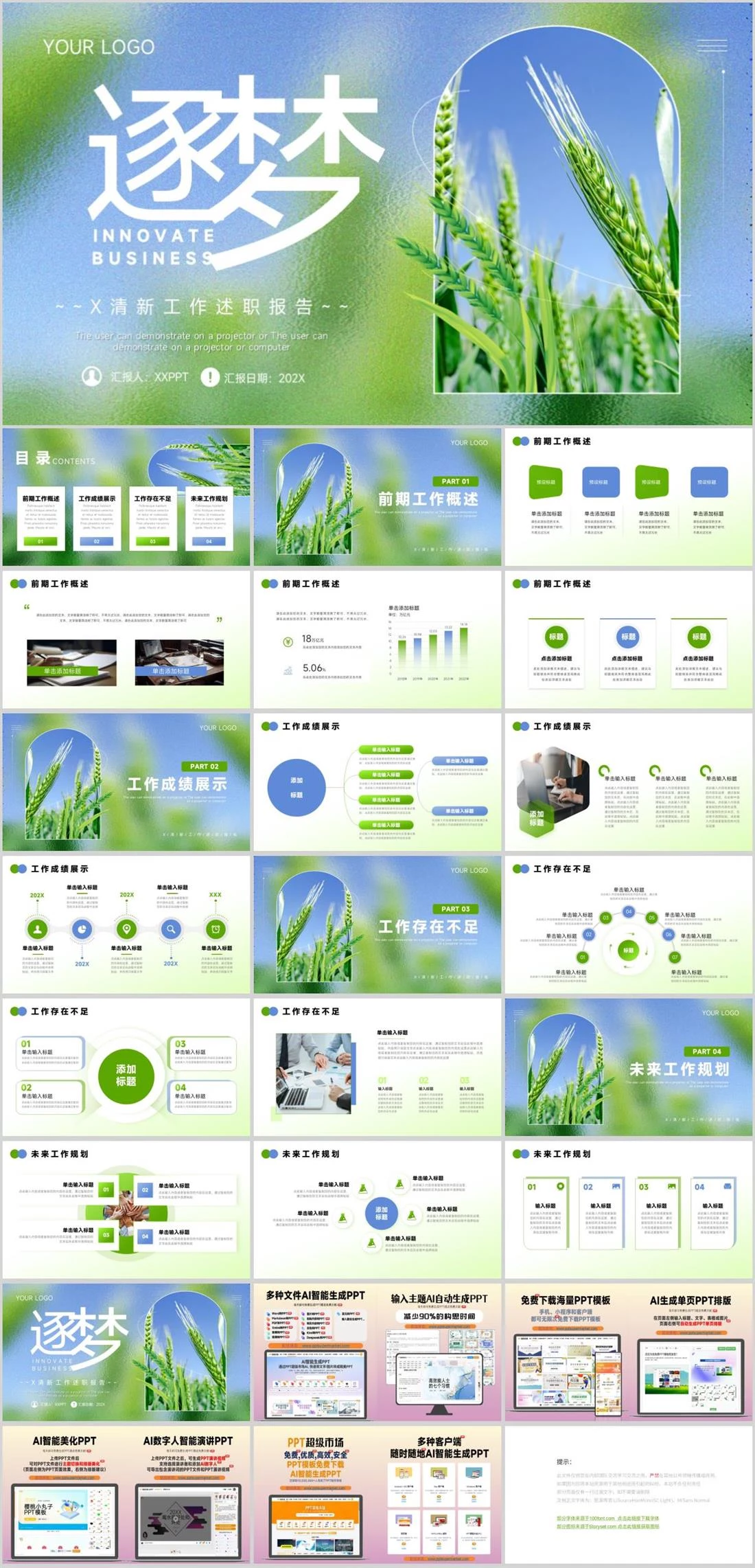 逐梦INNOVATEBUSINESS~~X清新工作述职报告~~YOUR LOGO 汇报人:XXPPT汇报日期:202XThe user can demonstrate on a projector or The user can demonstrate on a projector or comput简约商务,60,