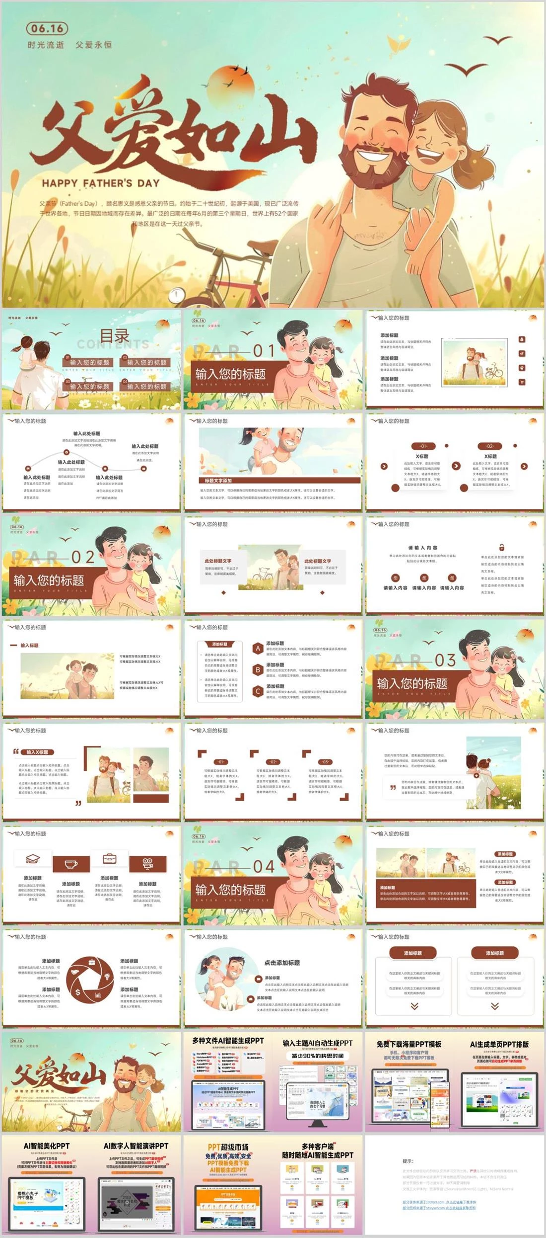 HAPPY FATHER'S DAY父亲节(Father's Day),顾名思义是感恩父亲的节日。约始于二十世纪初,起源于美国,现已广泛流传于世界各地,节日日期因地域而存在差异。最广泛的日期在每年6月的第三个星期日,世界上有52个国家和地区是在这一天过父亲节。06.16时光流逝父爱永恒节日班会,108,